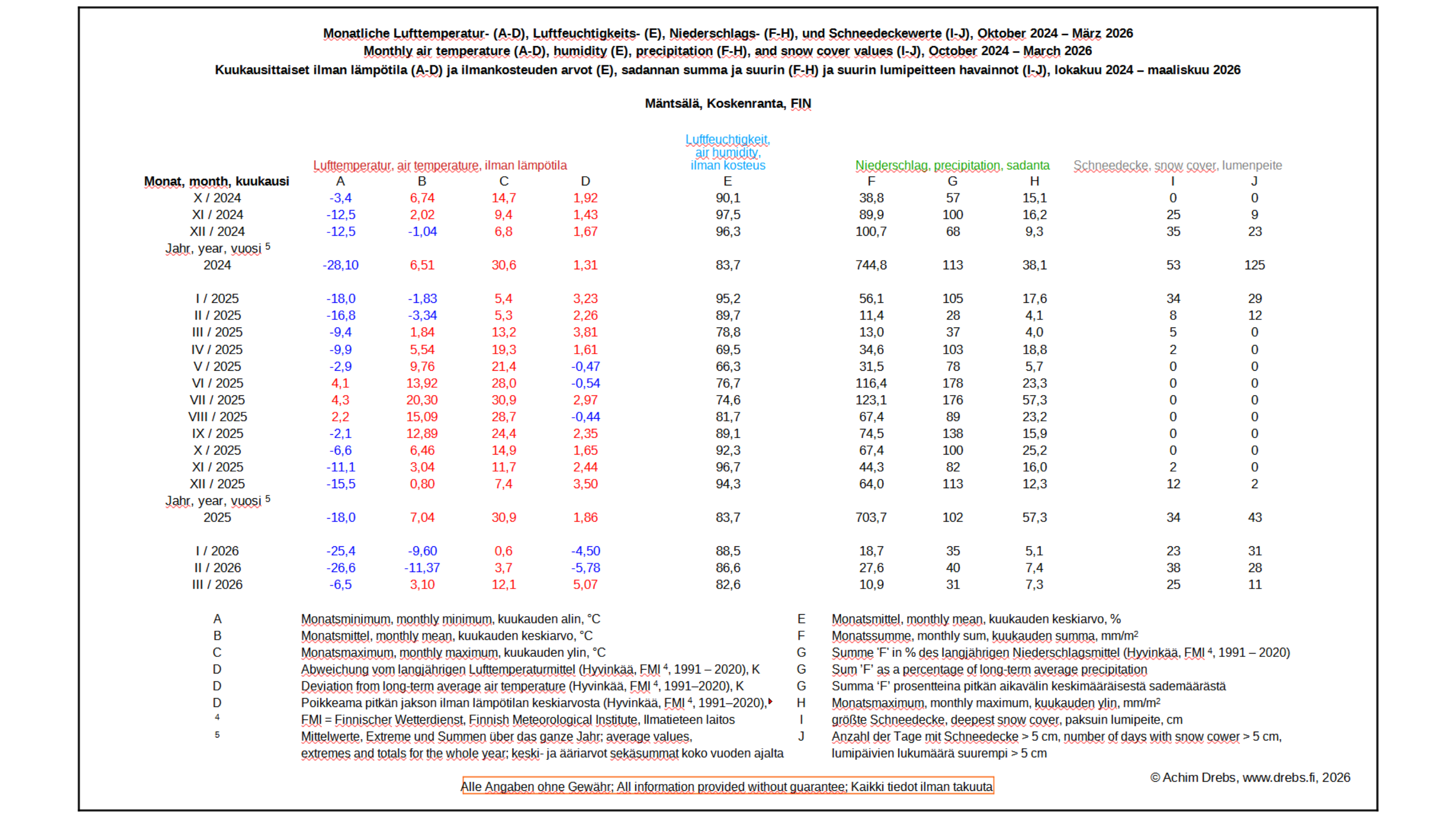 Luftfeuchtigkeit, Luftdruck und Niederschlag (Schneedecke,